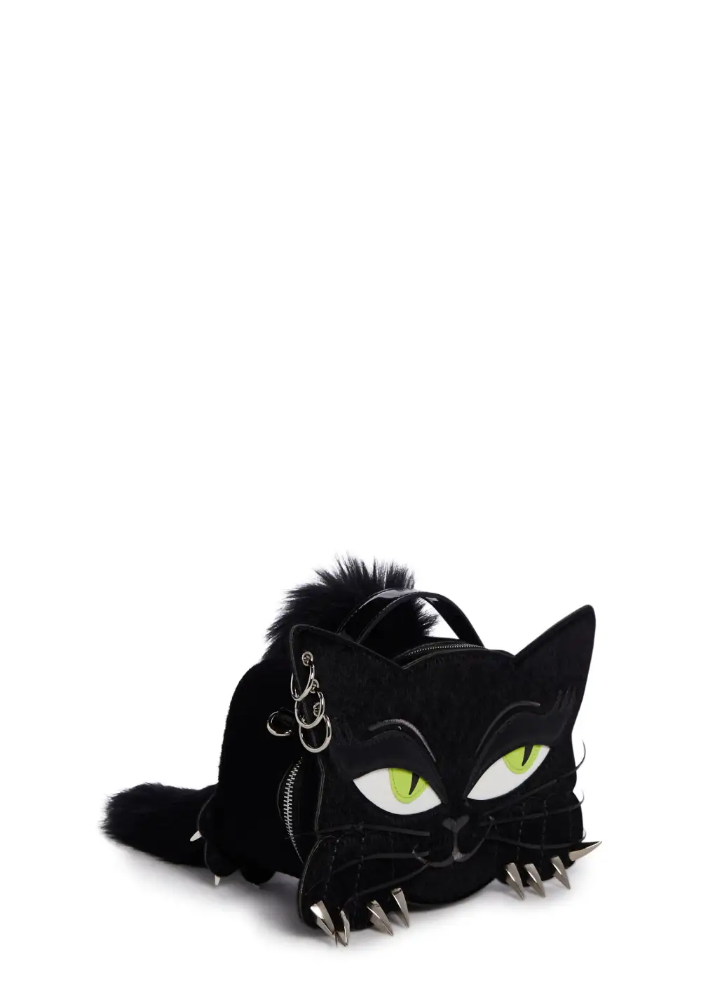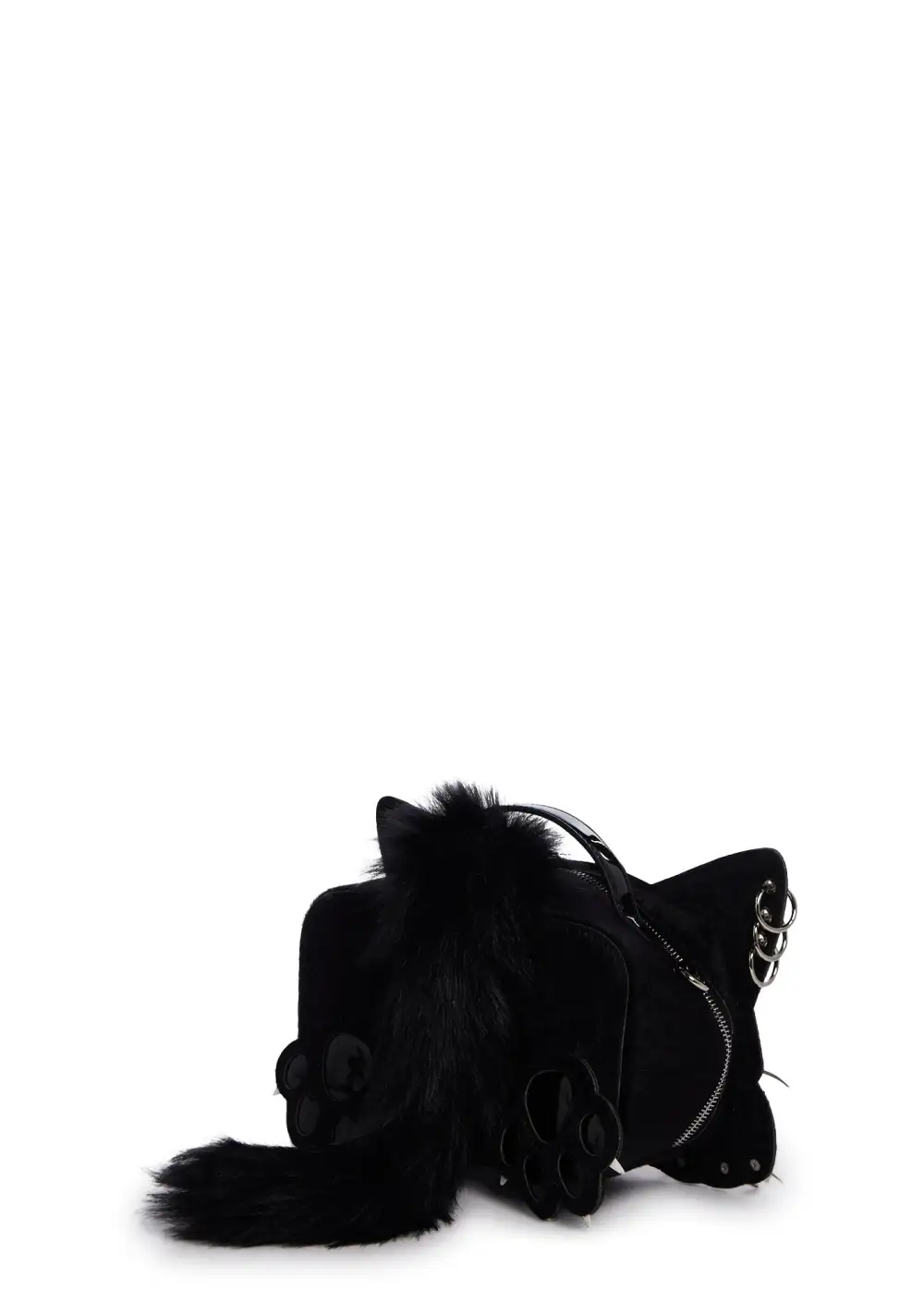 cuz show your kitties off! This cat shaped makeup bag has a patent vegan leather construction, embossed detailing, faux fur accents, piercings, metal claws, a removable adjustable shoulder strap, and a top zipper closure.
