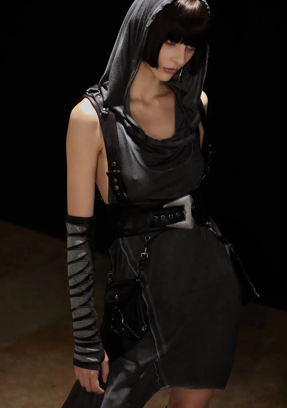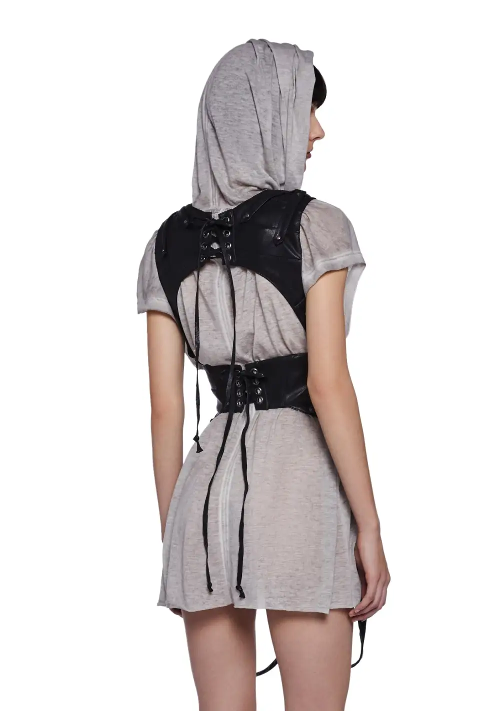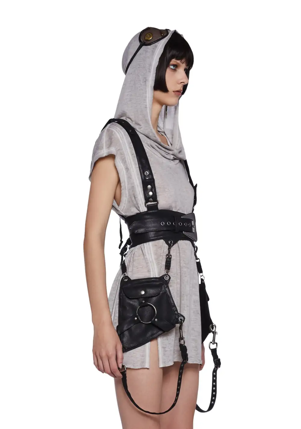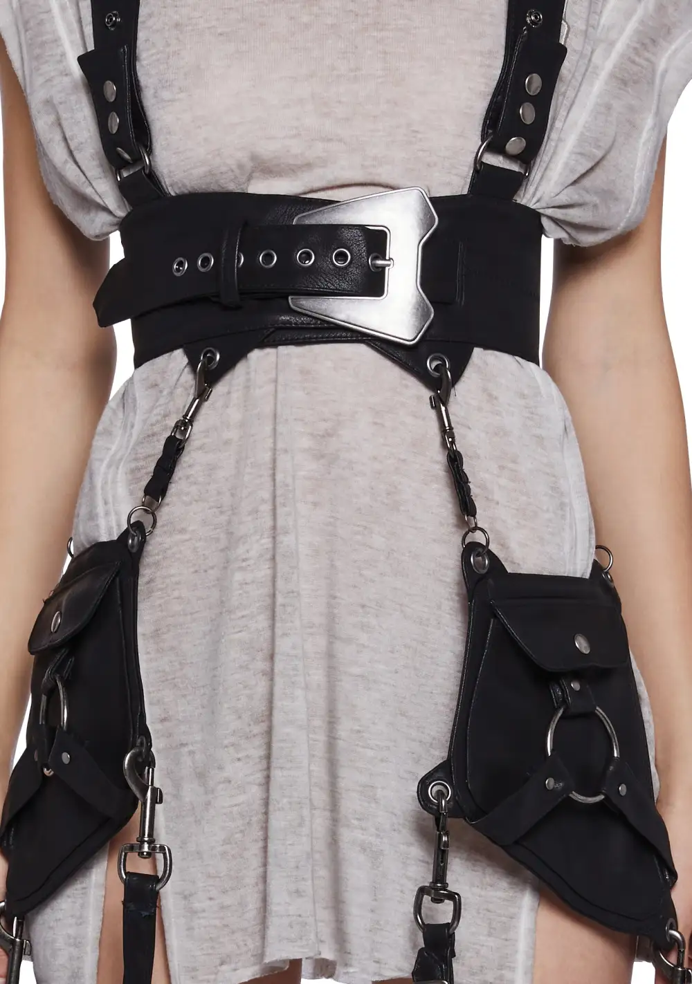 features a vegan leather construction with a western buckle belt, adjustable snap buttons, and two detachable pouch pockets with trigger clip hardware. This harness vest has lace-up details on the back and statement O-ring hardware on each hip bag.
