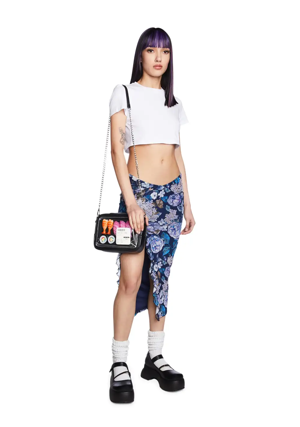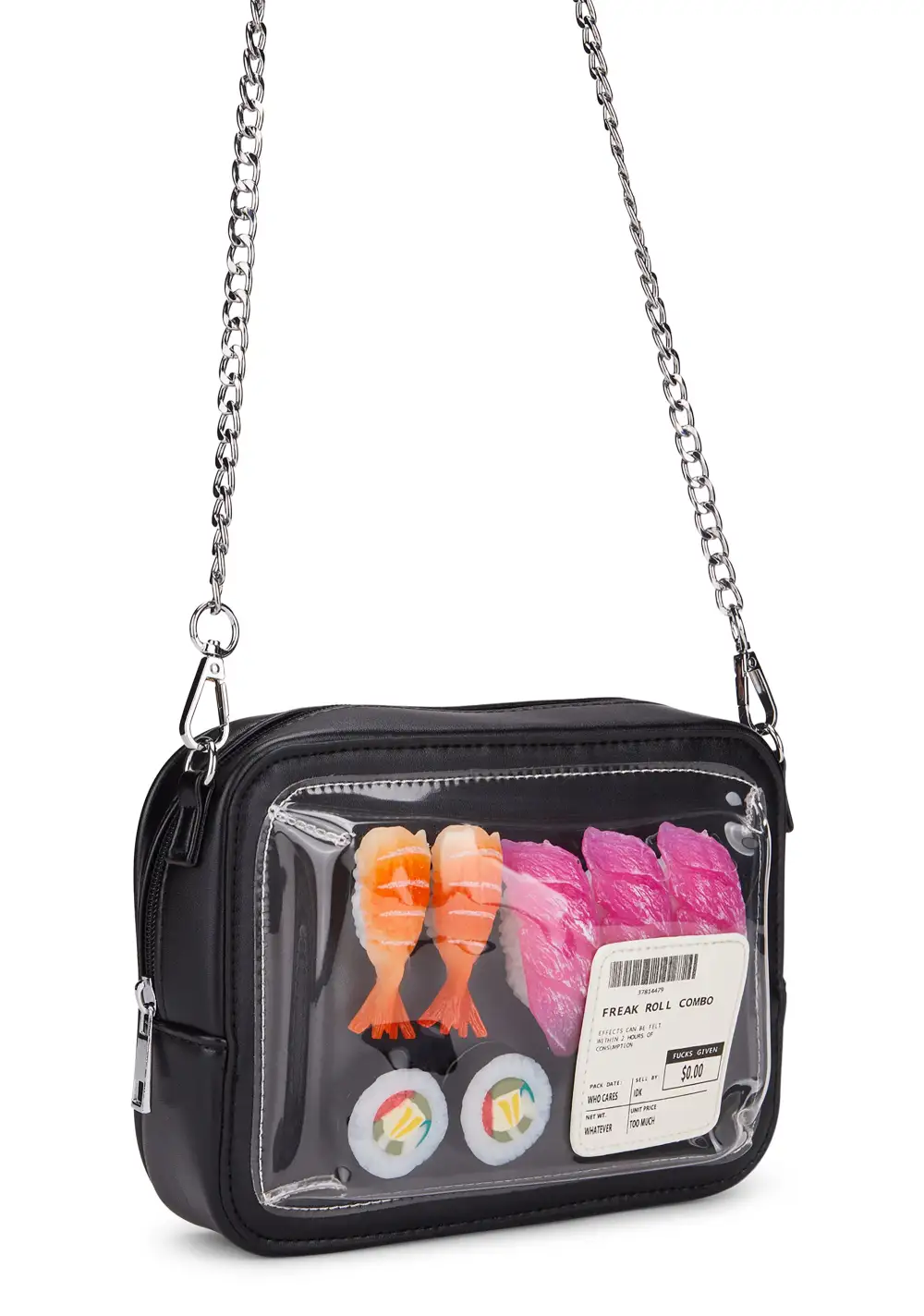 feelin' hungry? This novelty crossbody bag has a sushi platter design, a top zip closure, and a detachable chain shoulder strap.