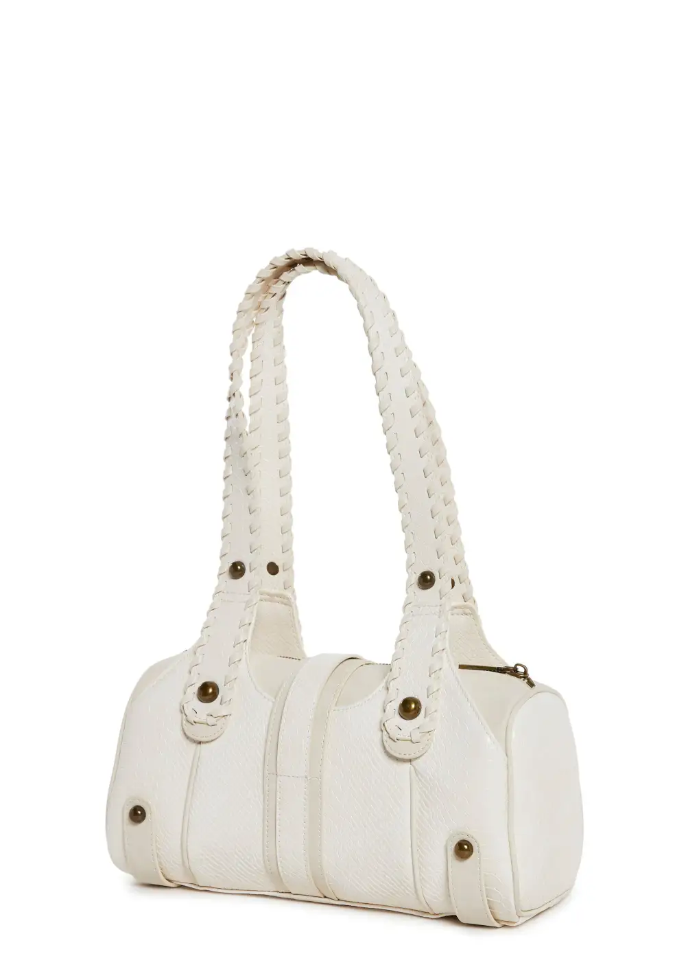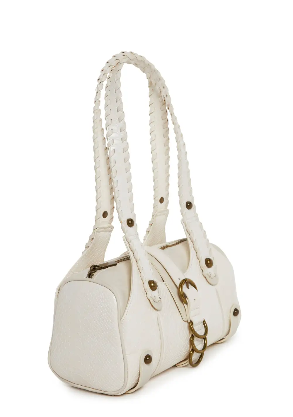 This bag has a vegan leather construction, a snake print pattern, whipstich shoulder straps, D-ring hardware, dome studs, and a top zipper closure.