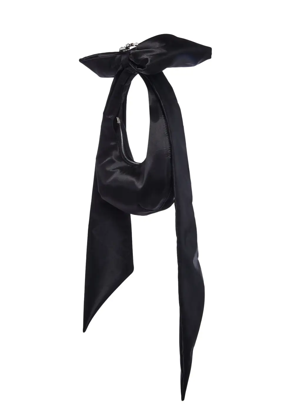 cuz everyone wants to be you. This bag has a satin construction, a ribbon handle with rhinestones, a centered heart adornment, and top zipper closure.