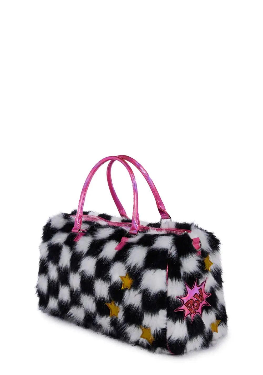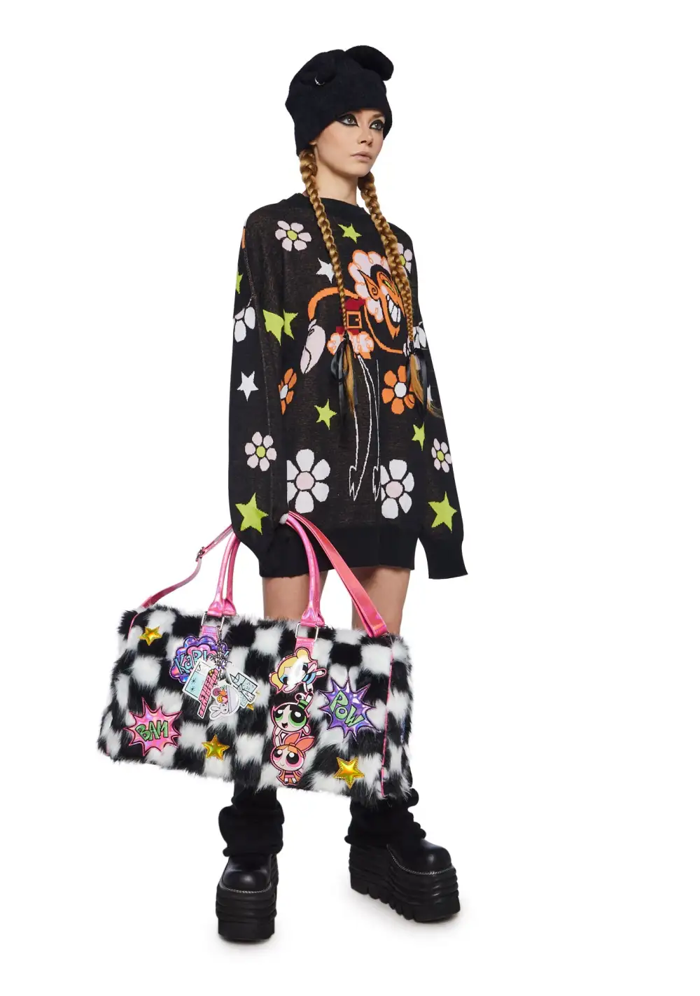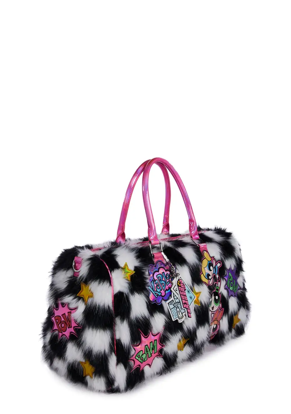 cuz you're too tough to play around. This PowerPuff Girls weekender bag has a checkered faux fur construction, holographic handles, a removable adjustable shoulder strap, charms, a top zipper, an inside pocket, and a PowerPuff Girls vinyl embroidered print.
