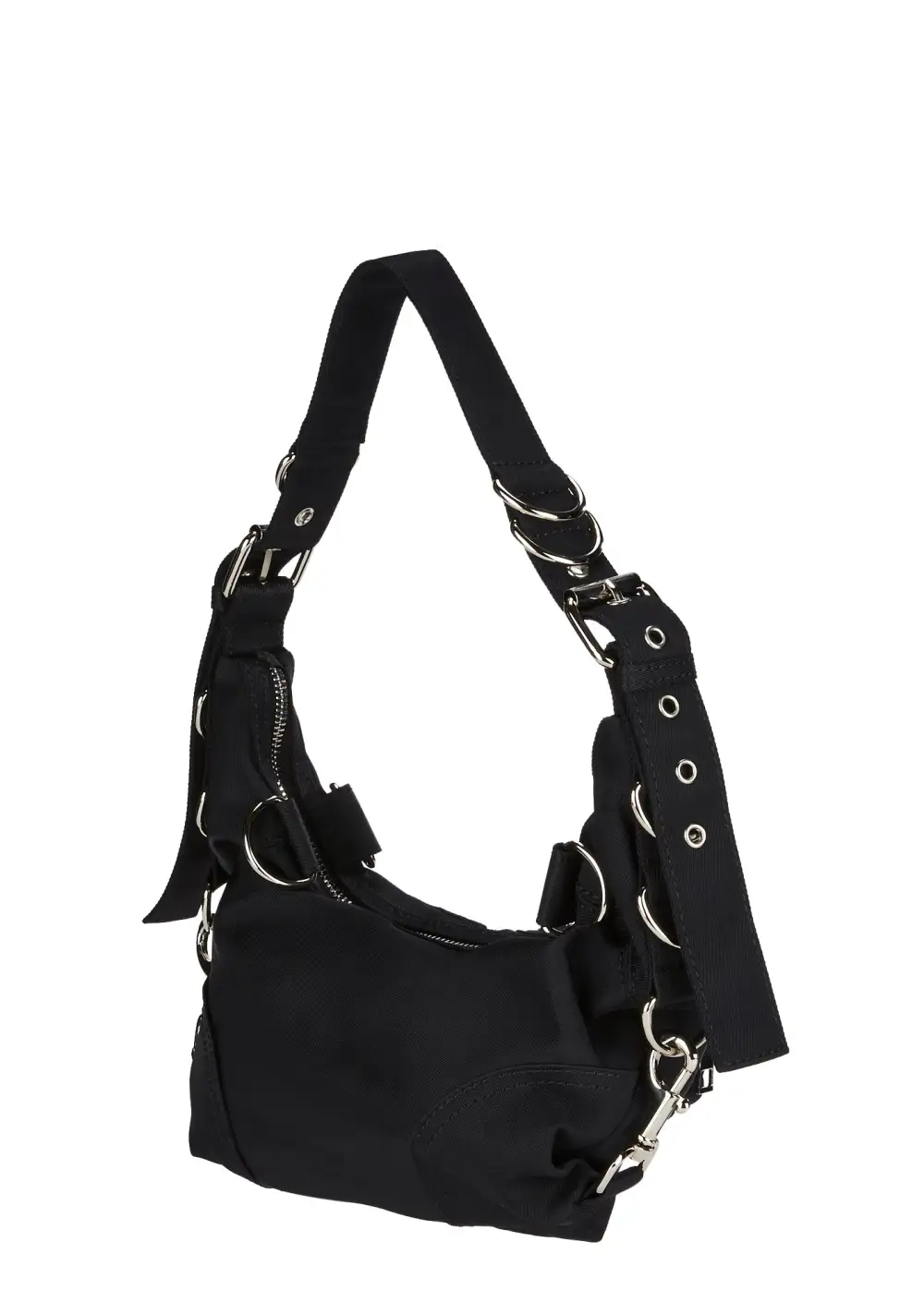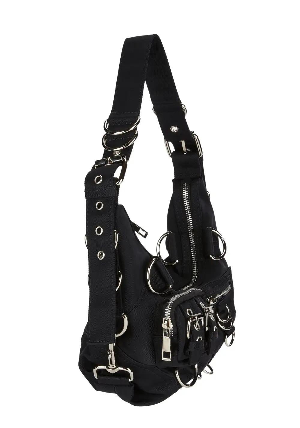 cuz you move to your own beat. This shoulder bag has a nylon construction, D-ring hardware, cargo pockets, buckle hardware, an adjustable shoulder strap, and a top zipper closure.