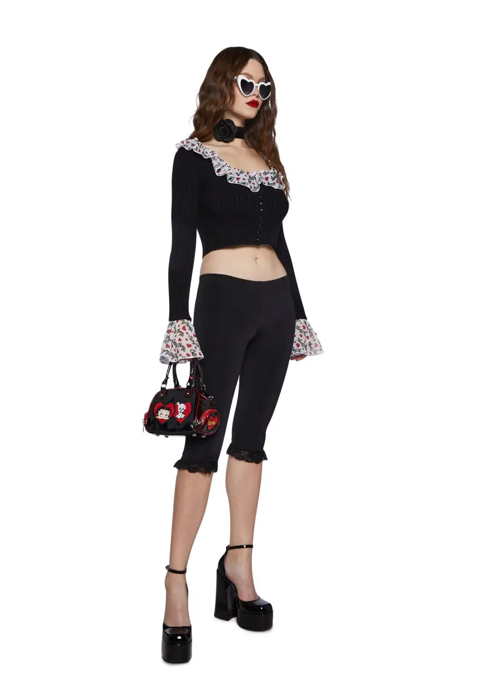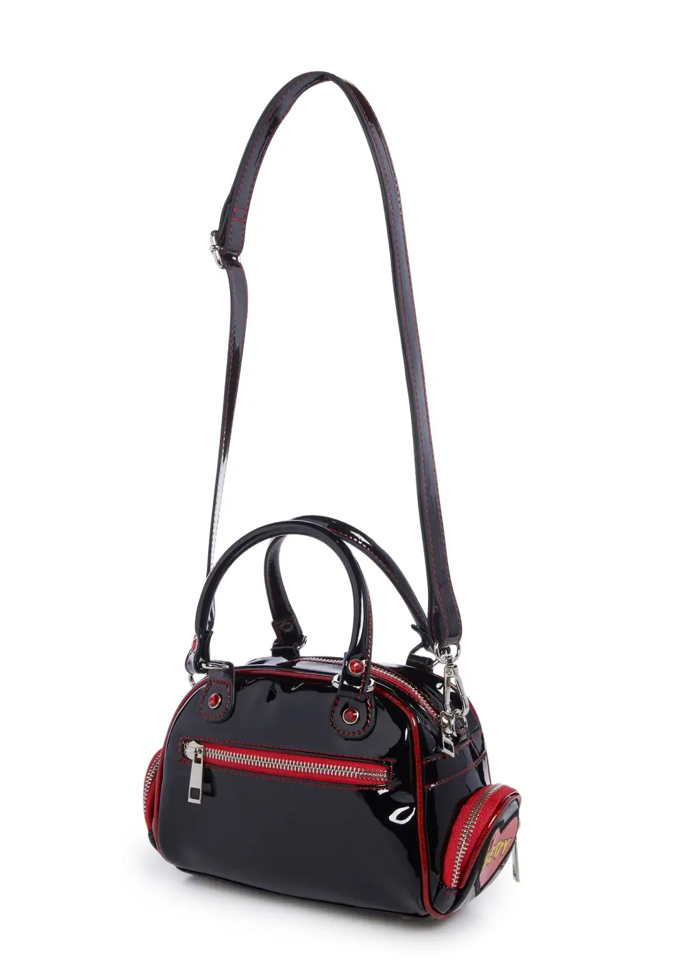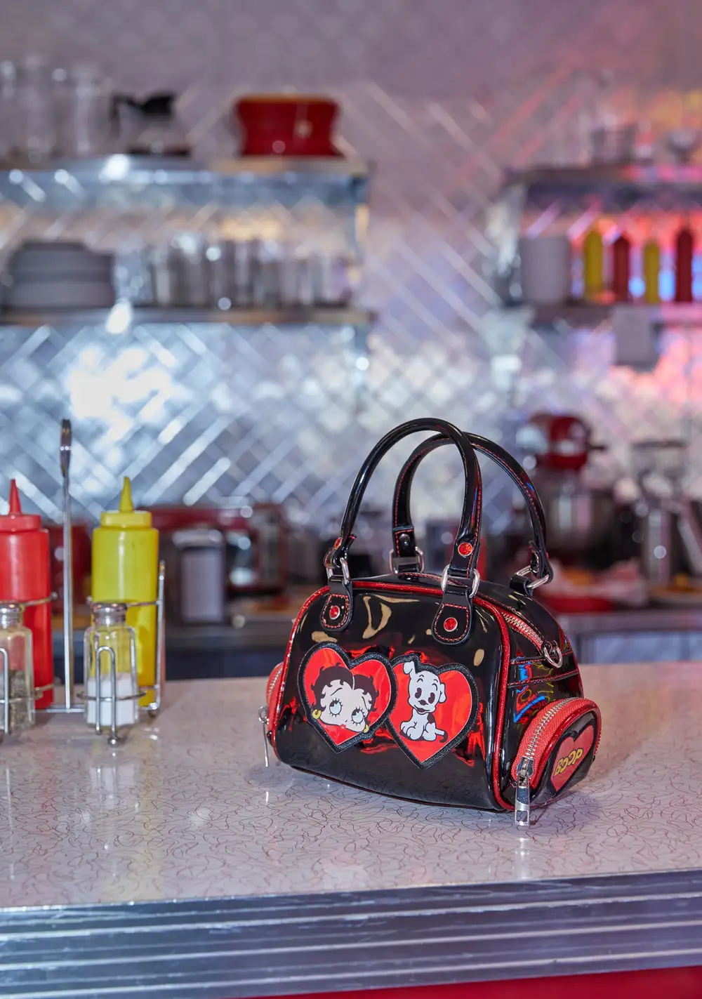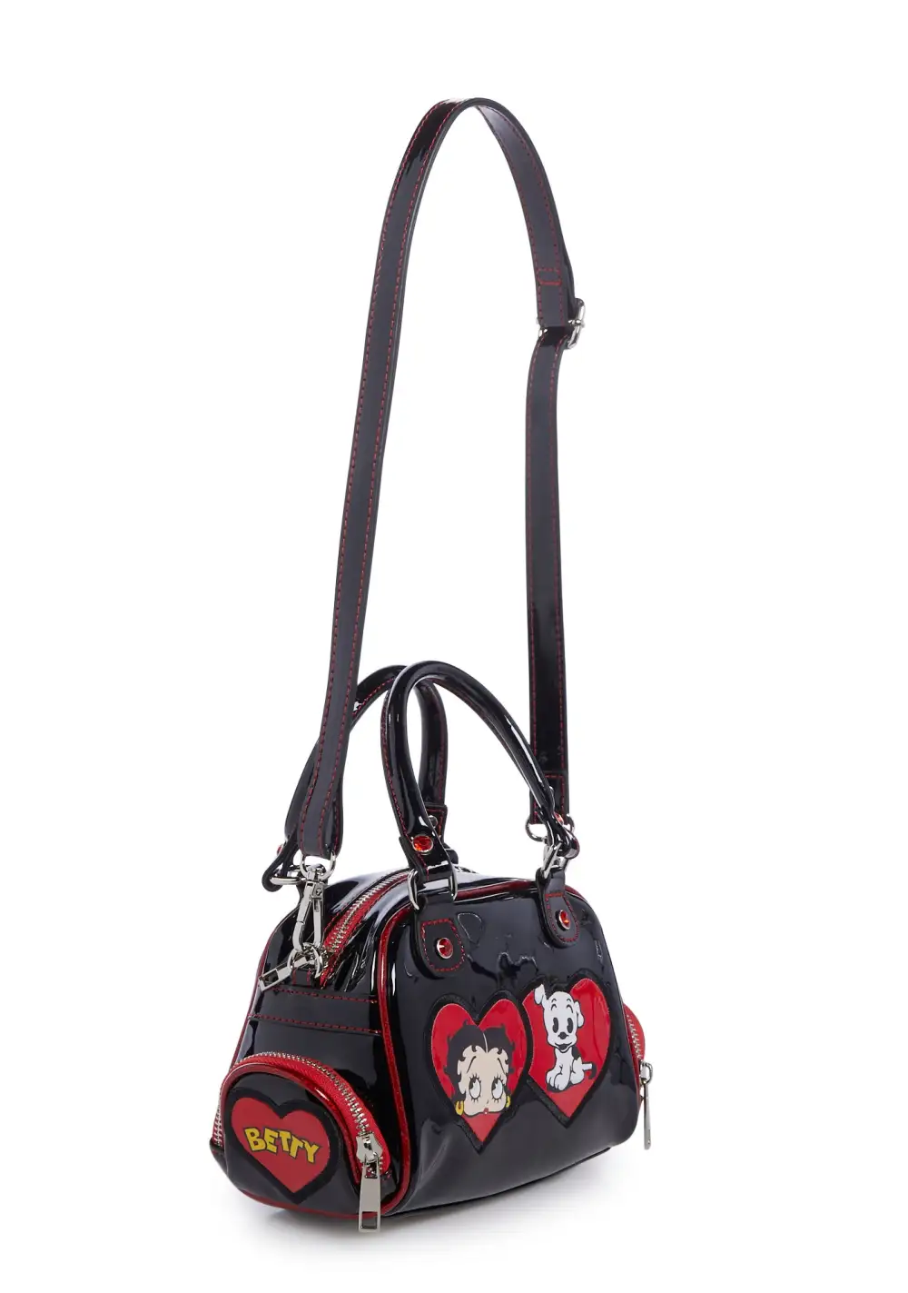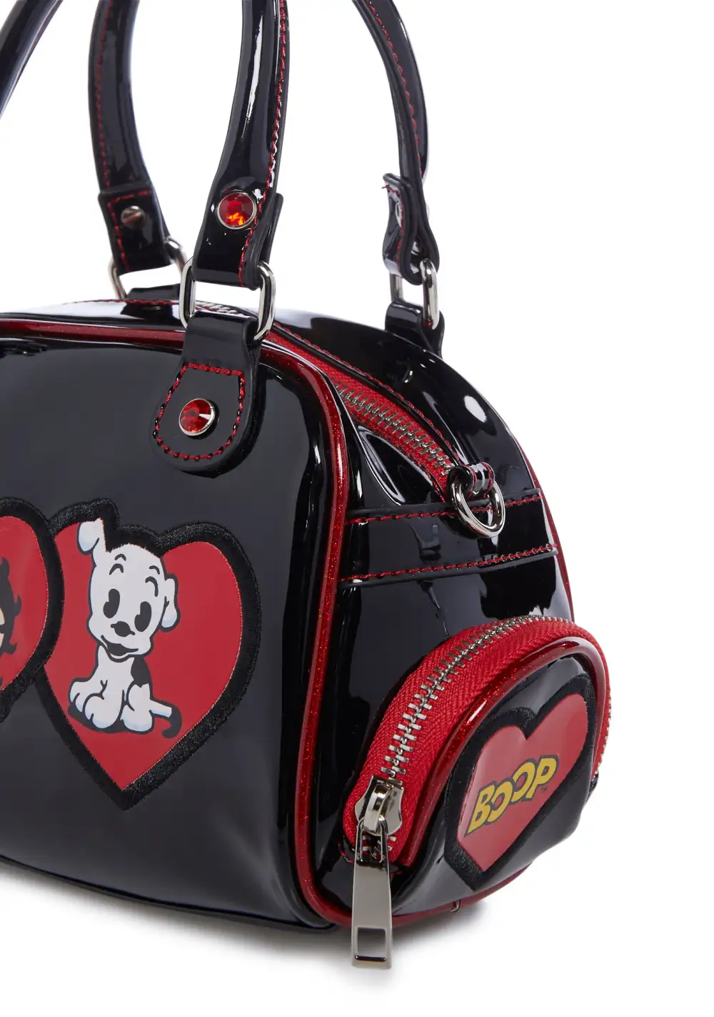 cuz you love that cute little doggy! This mini bowler bag has a patent vinyl construction, glitter detailing, zippered pockets on the sides, a back zipper closure, interior zippered pocket, top handles with jeweled detailing, a removable adjustable shoulder strap, a double heart graphic of Betty and Pudgy on the front, and a top zipper closure.