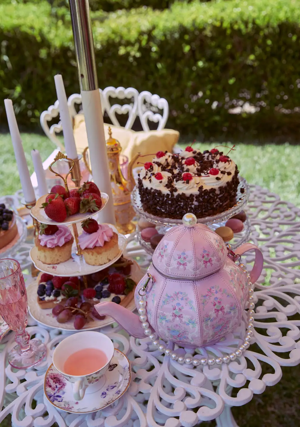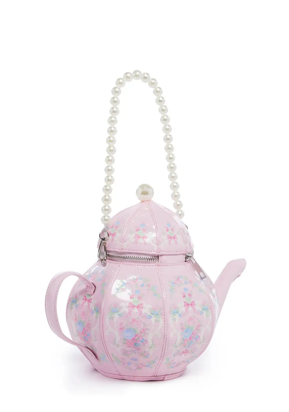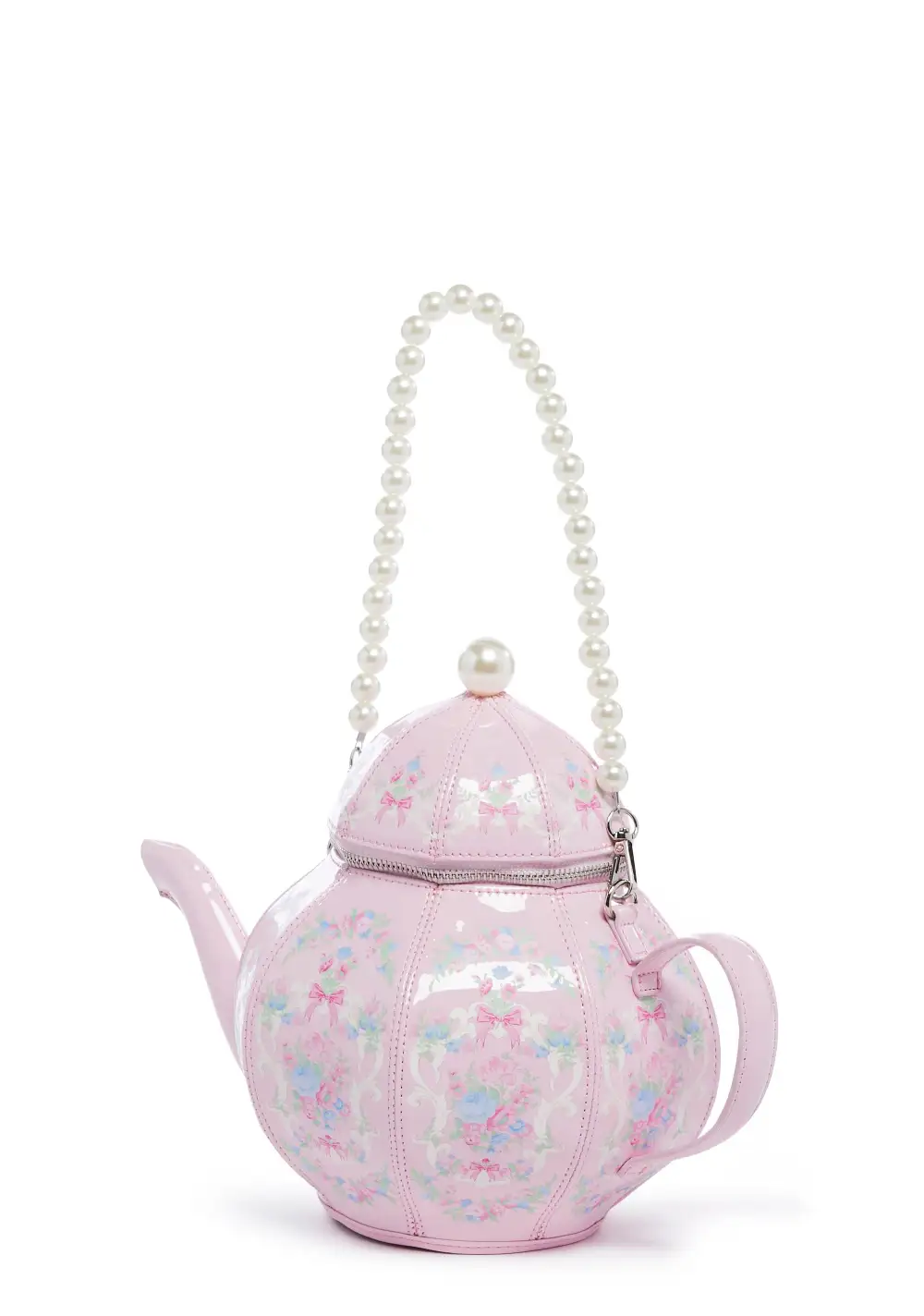 Darjeeling or Earl Grey? Dish it up with this teapot bag that has a patent vegan leather construction, an all over floral print, a detachable pearl shoulder strap, a top zipper closure, and comes with a detachable teacup zip up mini purse.